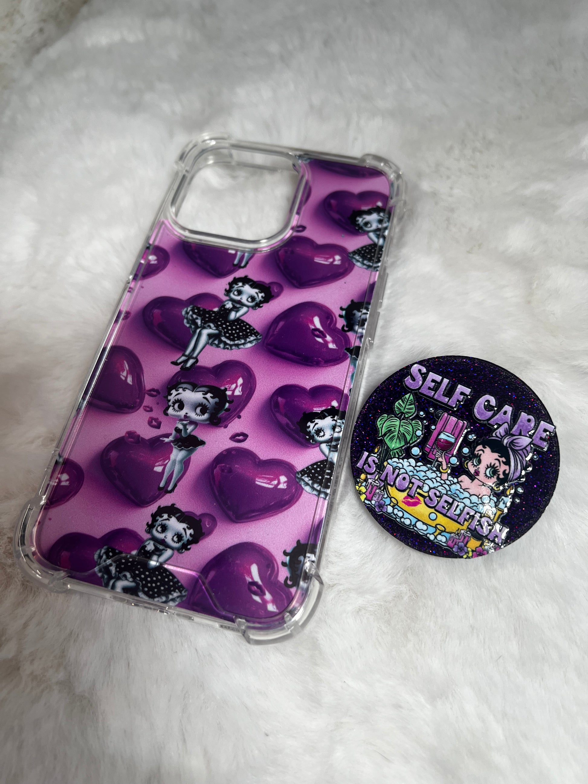 Wrap your phone in comfort, kindness, and a little reminder you didn’t know you needed. Featuring Boopy herself in the sweetest bubbly bath scene, this matching clear case insert and pop handle set turns everyday scrolling into a moment of calm.
