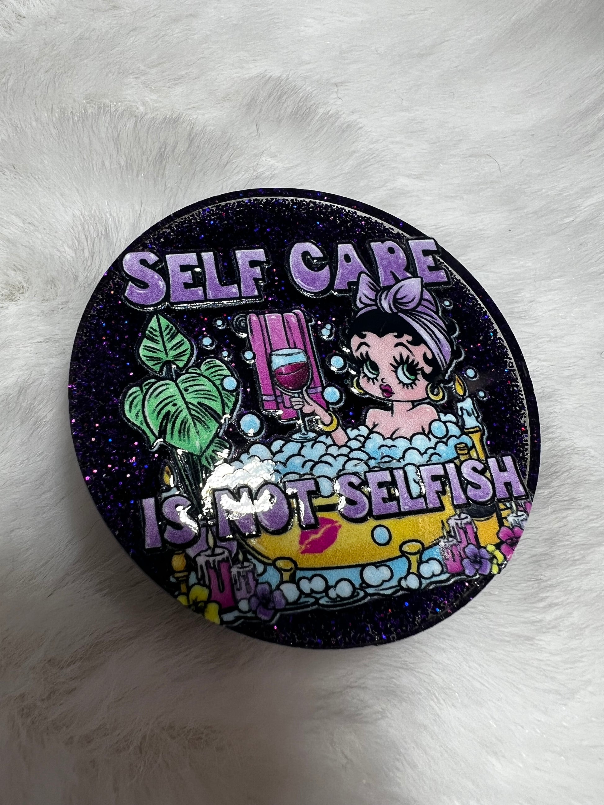 Designed in pretty, soothing purples, Boopy lounges peacefully in her bath, surrounded by bubbles and cozy vibes—gently reminding you to slow down, breathe, and take care of you. It’s the kind of design that makes you want to run a warm bath, light a candle, and just relax.